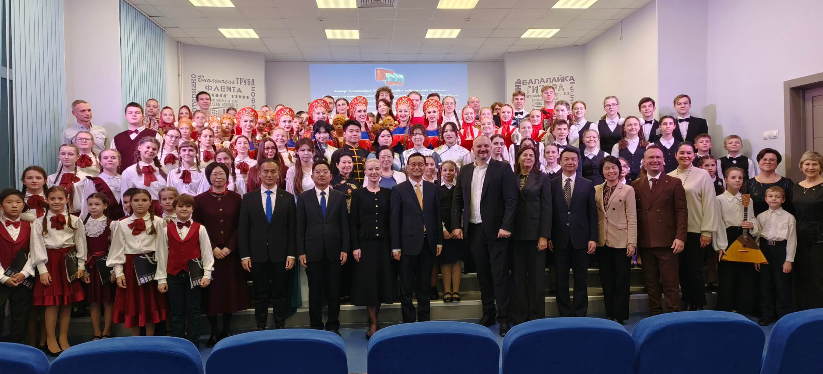 10月28日晚,主题音乐会隆重举行。中俄学子同台献艺,将现场氛围一次次推向高潮。音乐学院师生呈现的《念奴娇·赤壁怀古》等作品韵味悠长;而德米特罗夫儿童艺术学校合唱团用中文倾情演唱的《万疆》,更引发了全场强烈共鸣。肇庆市与当地政府官员莅临现场,对演出给予高度赞赏。